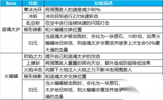 虽然迷宫并不复杂,但却又有不少守卫驻守其间,玩家被守卫攻击到后,则会受到中量伤害并被眩晕一段时间。因此,各位玩家在破解迷宫的时候可要多加小心。 双生之刃——追魂太岁、火蝙蝠 追命太岁和火蝙蝠可以说是这个副本中最让玩家们头疼的Boss了,他们不但拥有强大的攻击力,还有令人无语的复活能力,只有将他们在短时间内同时消灭才可以彻底杀死他们。 让我们先来看一下他们的技能一览: