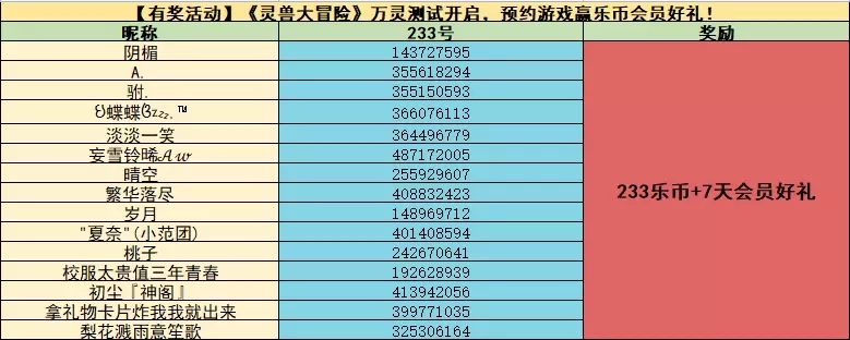 官方将会从所有参与成功的玩家中抽取15位获得233乐币+7天会员好礼!