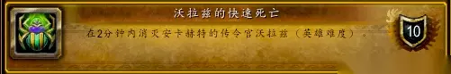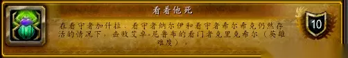 古代王国(涉及到三个成就:尊敬长者、志愿工作、沃拉兹的快速死亡) 尊敬长者成就做法:就是不击杀安卡哈守卫者的情况下击败王国老1。 安卡哈守卫者技能身上带一个30码光环,在光环内除开自己其它小虫和BOSS都处于无敌状态。 需要两个坦克或者一个能扛得住的板甲职业,一个拉住BOSS,另外一个在小怪阶段,拉着看守者远离30码,输出打BOSS即可完成。