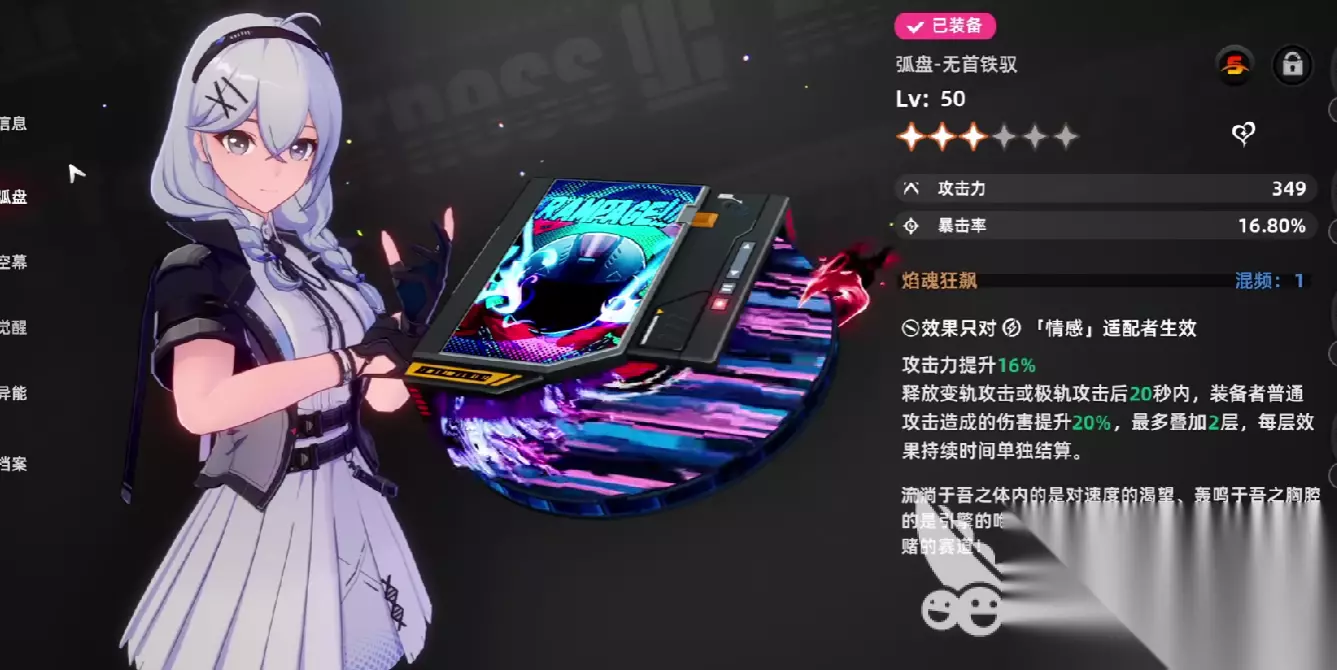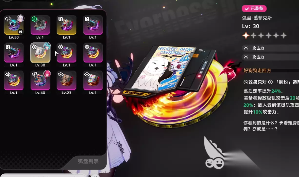 功能型弧盘包含有墨菲克斯、时空回响。 墨菲克斯在持有者进行了一次极轨攻击之后,如若控制成功敌人,则可以提升基础攻击倍率,控制效果可以提升三层,同时也可以提升持有者的蓄力攻击速度,加快大招循环。