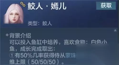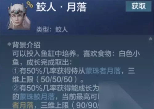 鲛人月落: 1、可通过深海垂钓或者商城礼包购买获得。 2、养殖建议在鱼缸里,原因是即使饱食度不够也不会死,只会休眠; 可以投入鱼缸中培养,喜欢食物:白色小鱼,成长完成取出: 1、有50%几率获得侍从蒙珠者月落,三维上限(50/50/50)。 2、有50%几率获得能成长为更强力侍从的蒙珠皎月落,当前最高可以成长为寿天者月落,三维上限(90/90/90) 总结: 我认为最好的人鱼就两个,分别是人鱼嫣儿和人鱼千月 1、嫣儿专精千机弩,千月夹弩,不会因为资质而改变专精。 2、并且皆为女性鲛人,在外观和颜值上绝对值得肯定,收藏和出战价值高; 3、在资质评价上不低,最高可达到90点,这是普通侍从无无法比拟的; 4、各有各的技能以及特点,但无一例外即可为玩家创造更多的输出以及保护能力。 人鱼要养的,有几率可以弄到五十,不过就是要六个阶段,但是,如果有一个阶段变成招募令,那你就要重新养,所以很看脸。