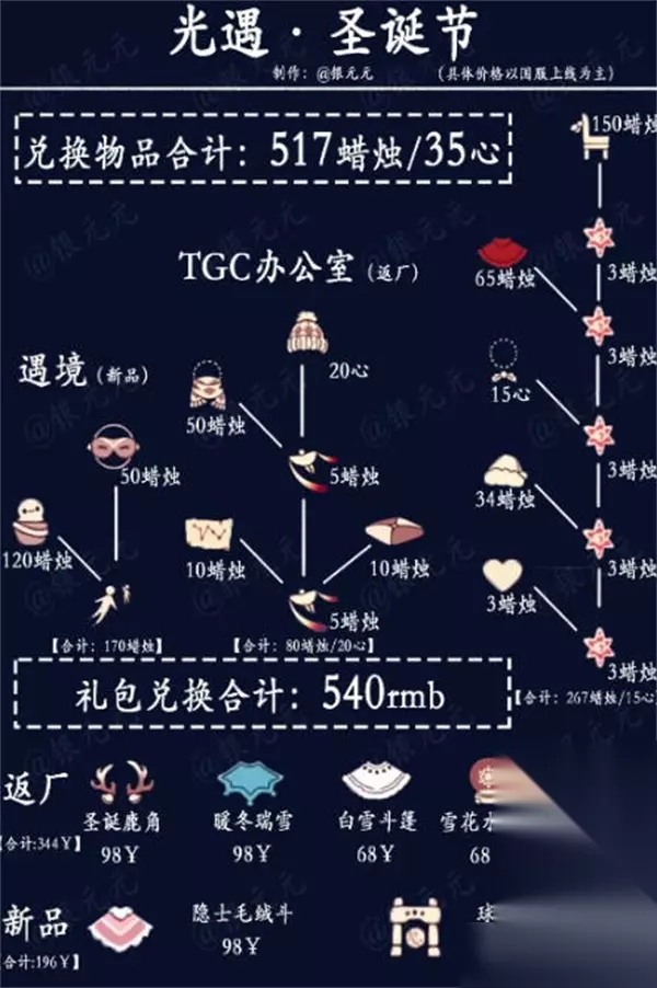 《光遇》圣诞节活动兑换图一览 1、圣诞节活动在12月24日开始的,整个圣诞节礼包的价格差不多在540rmb左右,需要517蜡烛,35爱心; 2、如图所示,圣诞领结15心、圣诞斗篷65蜡烛、圣诞椅150蜡烛、圣诞帽34蜡烛、圣诞围巾50蜡烛、乐谱10蜡烛、坐垫10蜡烛、绒帽帽20心、小雪人120蜡烛、护目镜50蜡烛。以上总价,高达517蜡烛35心; 3、国服的礼包,主要有圣诞鹿角98元、暖冬瑞雪斗篷98元、白绒斗篷68元、雪花发卡12元、水晶球68元、白雪斗(隐士毛绒斗)98元、球套装(球门和球)98元。新旧一共七个礼包,价值540元。
