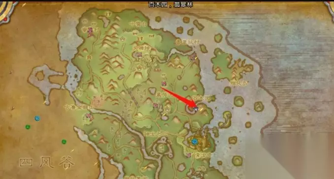 永恒岛位于潘达利亚地图的右下角,该地图禁止飞行,按照固定路线往“干耳朵圣殿”的方向走,在烈火之路的位置可以看到红色的翔龙。