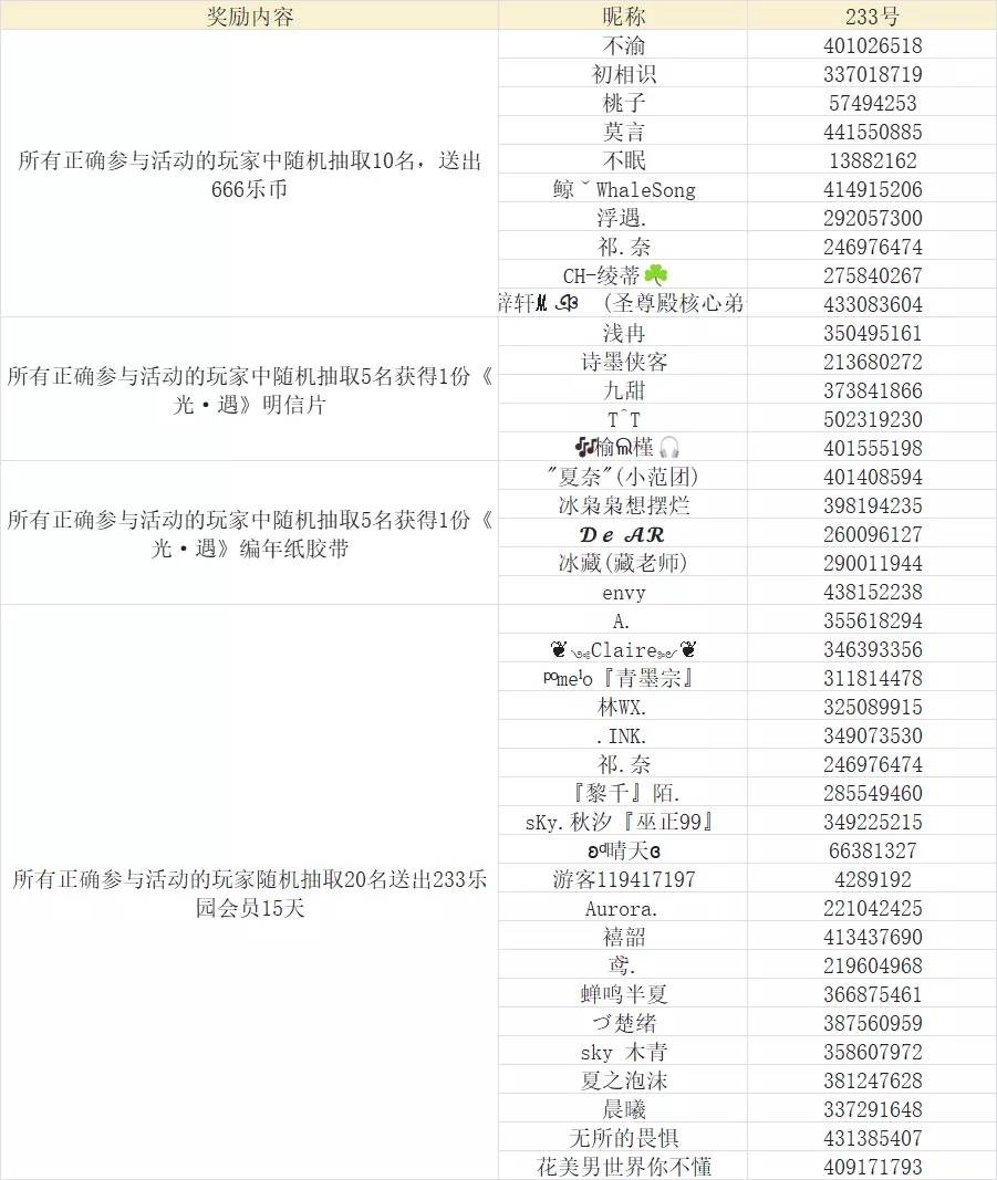奖励五:所有正确参与活动的玩家随机抽取20名送出233乐园会员15天