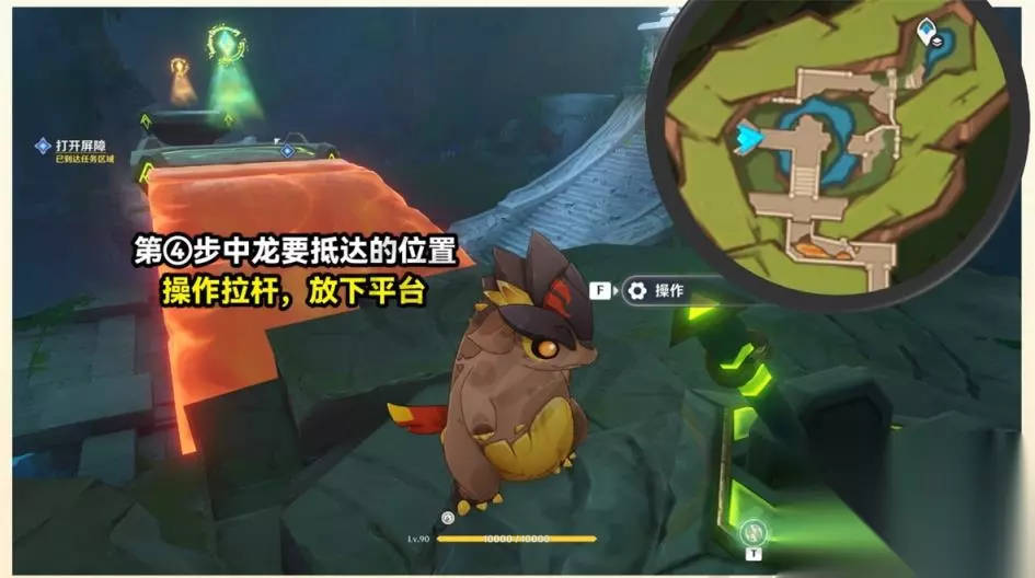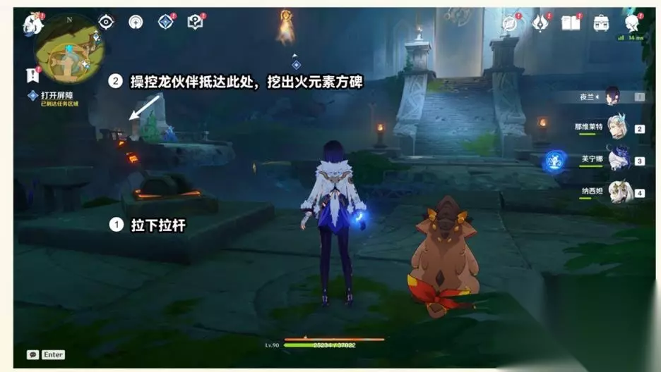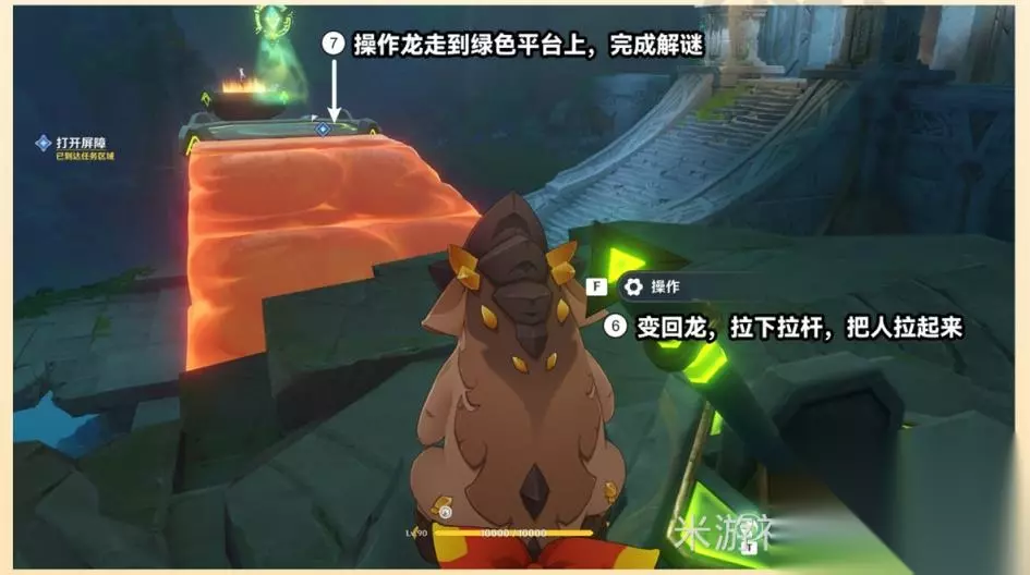 2、打开屏障 ①拉下拉杆,操控龙伙伴抵达此处,挖出火元素方碑