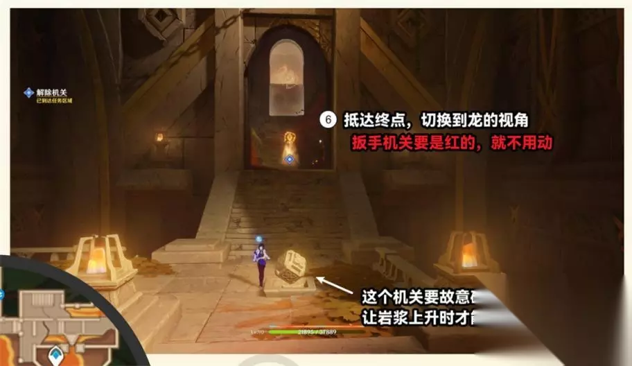 ⑥抵达终点,切换到龙的视角扳手机关要是红的,就不用动。这个机关要故意碰到激光让岩浆上升时才能操作