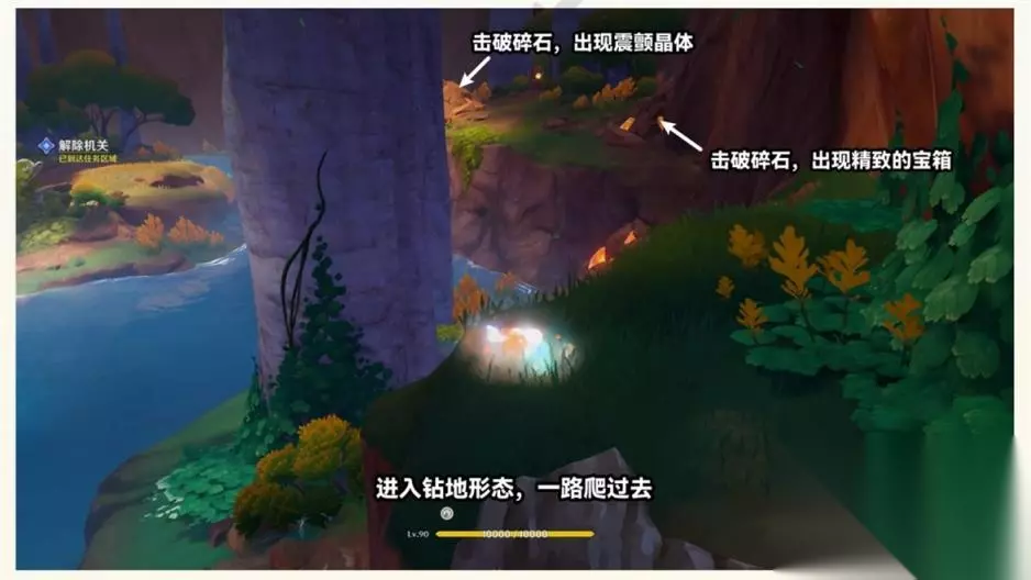 先来看龙伙伴这边的操作 ①进入钻地形态,一路爬过去。击破碎石,出现震颤晶体、精致的宝箱