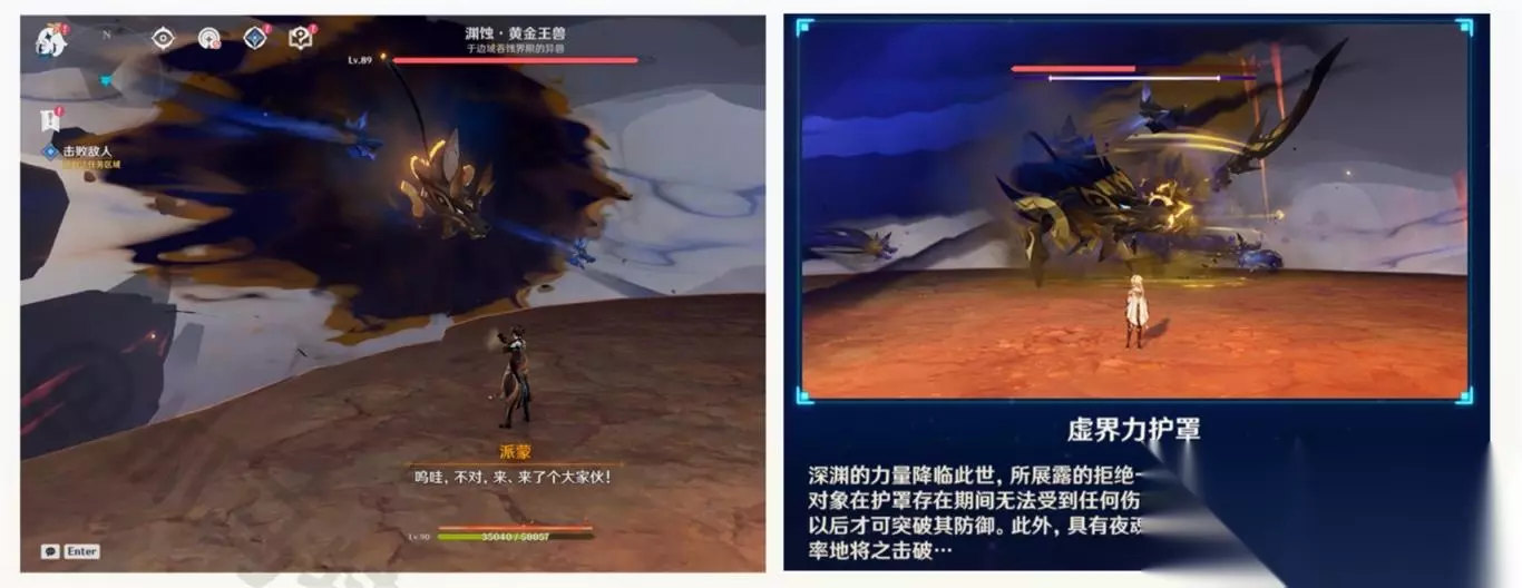5、人龙会和后,穿过岩浆,将与兽境猎犬、黄金王兽战斗。关底的黄金王兽需要利用元素攻击一定次数才能破盾