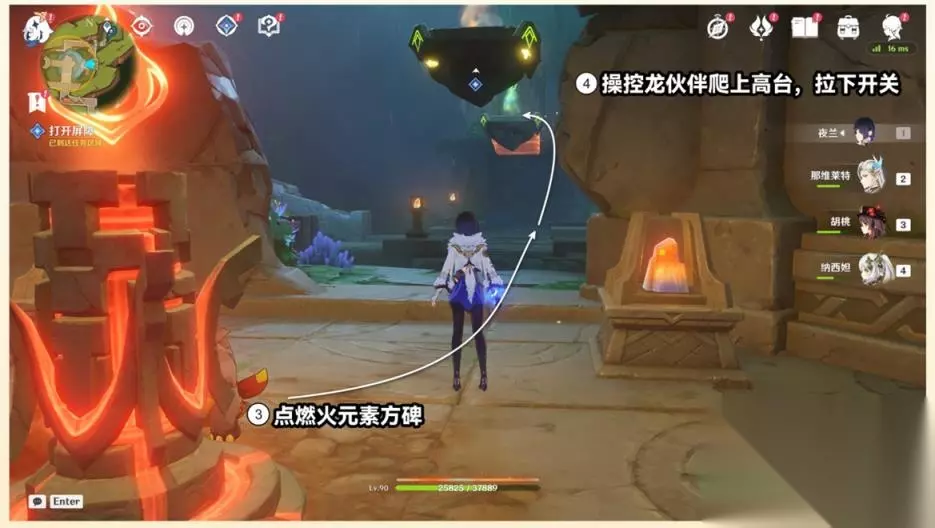 ③点燃火元素方碑,操控龙伙伴爬山高台,拉下开关