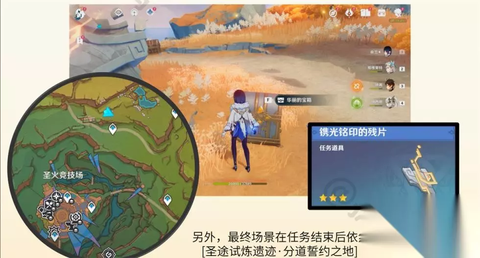 6、华丽的宝箱中能开出一个镌光铭印的残片,向圣火竞技场北部秋纽奥提交4个残片可以换取一个华丽的宝箱 注意:另外,最终场景在任务结束后依然可以通过传送到[圣途试炼遗迹·分道誓约之地]通过楼梯进入。