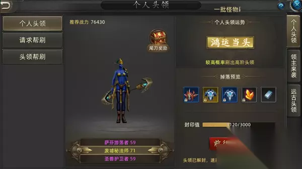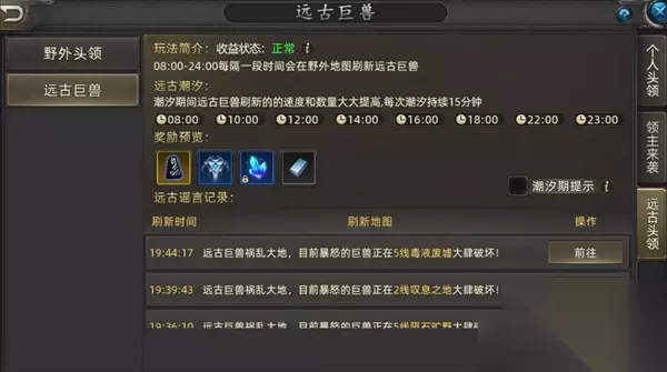 野外头领:野外主要是分为野外头领和远古巨兽,谁都可以去打,按照谁伤害高谁就可以拿到奖励,野外头领可以掉银币,而远古巨兽可以掉古董,奖励还是比较不错的。