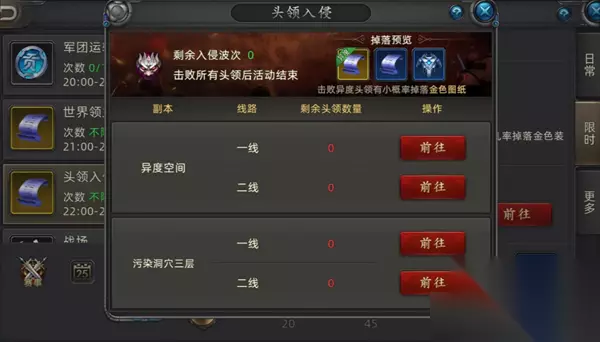 头领入侵:每天早上10点,下午2点,晚上10点,限时刷新在异度和污染的领主,只有在异度才有概率掉落金图和蓝图。 这个头领的奖励是按照尾刀来算的,谁是最后一击打死领主,谁就能拿到奖励,这个对于我们普通玩家最友好了,运气好抢到尾刀掉落张金图,几十万的金图就到手了。