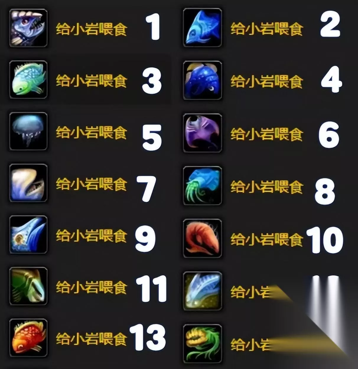 既然小燕的DEBUFF已经提醒大家它想吃鱼了,那我们就找点鱼喂它吧。经过玩家们的反复尝试和观察,我们发现它最喜欢诺森德的鱼,DEBUFF的图标和鱼的种类是一样的,很多不会钓鱼的玩家都不知道这些图标,所以小檀给每条鱼都标上了数字,并列出它们的名字如下: 第一种鱼:骨鳞爪鱼。 第二种鱼:冰川鲑鱼。 第三种鱼:圆头虾虎鱼。 第四种鱼:晶鳞鱼。 第五条鱼:北风水母。 第六条鱼:王鳐鱼。 第七条鱼:深海巨肚鱼。 第八条鱼:月光墨鱼。 第九条鱼:龙鳞神仙鱼 第十条鱼:蚌背鱼。 11号鱼:尖齿鲱鱼。 第十二种鱼:水母。 第十三条鱼:喷泉金鱼。 第十四种鱼:小亚口鱼。