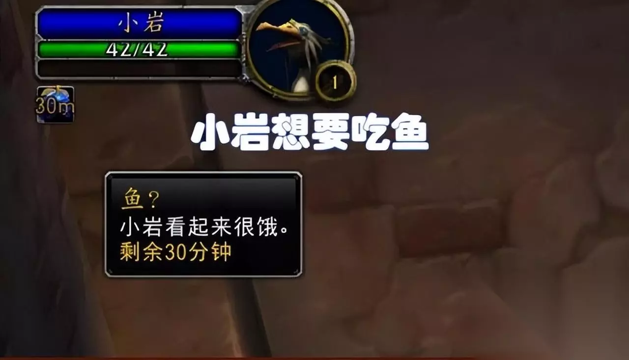 玩家每次召唤小炎都会发现它有一个饥饿BUFF,持续时间长达30分钟。这个DEBUFF告诉玩家小燕想吃鱼。