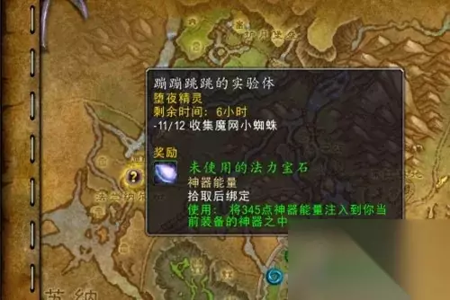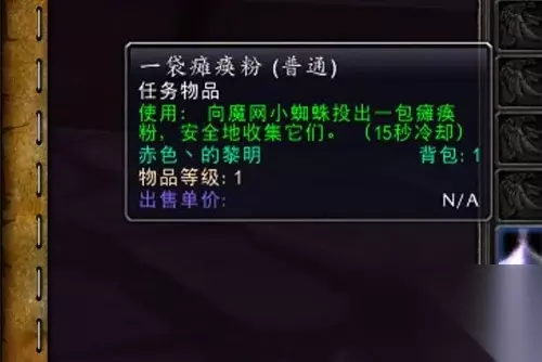 玩家可以使用一袋瘫痪粉药品放倒魔网小蜘蛛,再把它们放倒背包里面即可完成任务。 完成之后可以得到大量的堕夜精灵的声望值奖励,还有神器能量的物品。