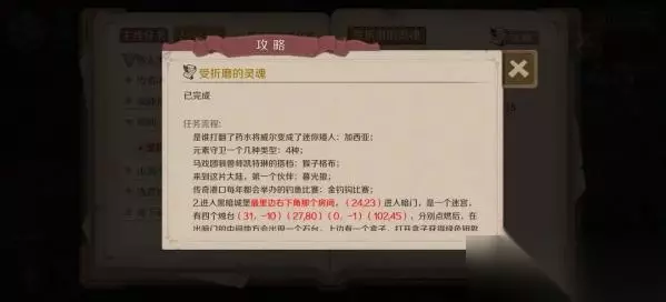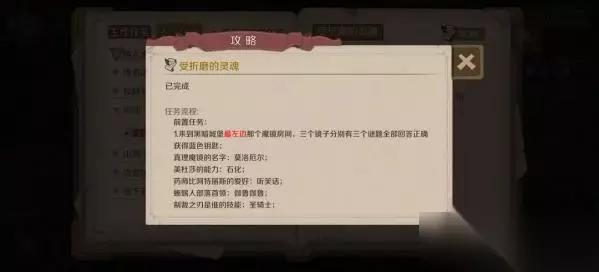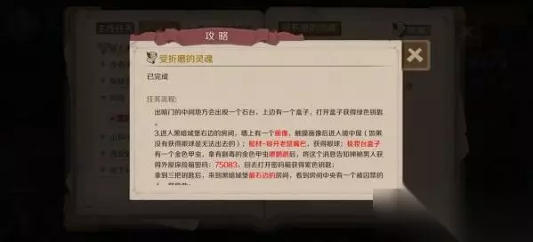 时间之钥受折磨的灵魂任务攻略任务前置:1. 来到黑暗城堡最左边那个魔镜房间,三个镜子分别有三个谜题全部回答正确获得蓝色钥匙。2. 获得蓝色钥匙后,进入黑暗城堡最里边右下角那个房间,进入暗门,是一个迷宫,有四个烛台,分别点燃后,在出暗门的中间地方会出现一个石台,上边有一个盒子,打开盒子获得绿色钥匙。任务详解:进入黑暗城堡右边的房间后,你将会遇到受折磨的灵魂。你首先需要选择与灵魂对话,并获得他的帮助。他会告诉你一个秘密通道的位置,通过这个通道,你将能够找到一个隐藏的区域。在这个区域里,你将需要解开一系列谜题,最终找到时间之钥。任务完成后,你将能够获得一些奖励,包括一些装备和经验值。同时,这个任务也会解锁一些后续的支线任务,这些任务将带你探索更多的地下城和宝藏。请注意,这个任务需要一定的冒险精神和策略性思维。建议在有足够的能力和装备支持的情况下再尝试完成这个任务。此外,你还需要熟悉游戏中的其他任务和角色,以便更好地在游戏中探险和升级。希望这份攻略能够帮助到你!更多时间之钥支线任务攻略可以到下方的相关文章栏目查询。如果有任何疑问或建议,欢迎留言联系我们。 时间之钥受折磨的灵魂支线任务攻略