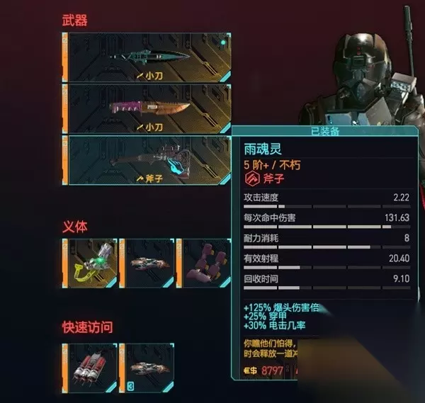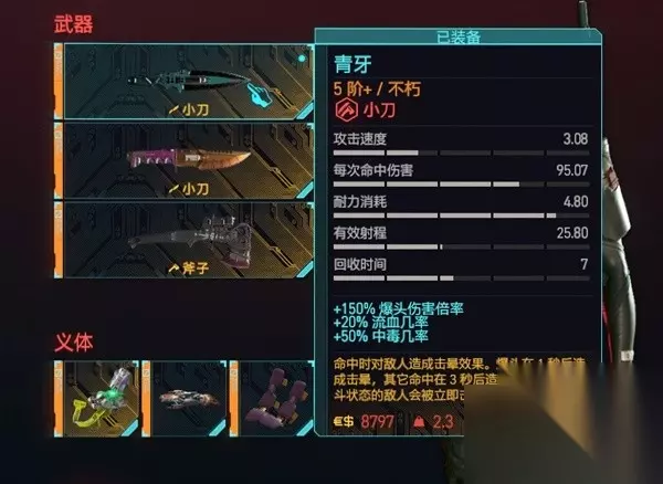 武器方面 推荐两把刀一把斧头,青牙,猎头,雨魂灵。 青牙,猎头两把刀可以直接买。 青牙的效果非常逆天,眩晕是可以直接绕后扭脖子的,而青牙的效果能作用于赛博精神病和暴恐机动队身上。 所以小刀流打暴恐机动队的流程就是,飞一下青牙,上去扭脖子,就死了。青牙近战也触发眩晕,实际效果只能说是官方作弊器,a一下,扭脖子,一气呵成。 猎头的作用和他描述的一样,不能秒的敌人猎头起手+雨魂灵打头就行了。 雨魂灵是全游戏最炫酷的武器,打击感t0的存在。一次暴击可以引发连环爆炸,而连环爆炸还能把人炸飞。 而雨魂灵较高的基础面板也能用于近战a人,不想飞了近战a人也是可以的。