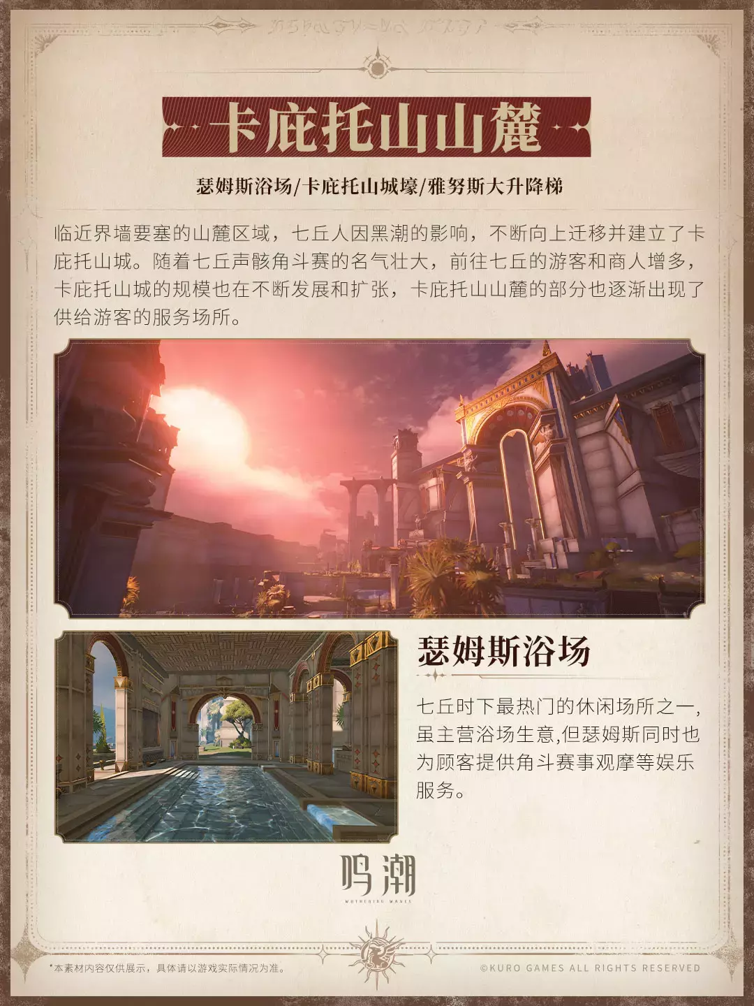 随着七丘声骸角斗赛的名气壮大,前往七丘的游客和商人增多,卡庇托山城的规模也在不断发展和扩张,卡庇托山山麓的部分也逐渐出现了供给游客的服务场所。