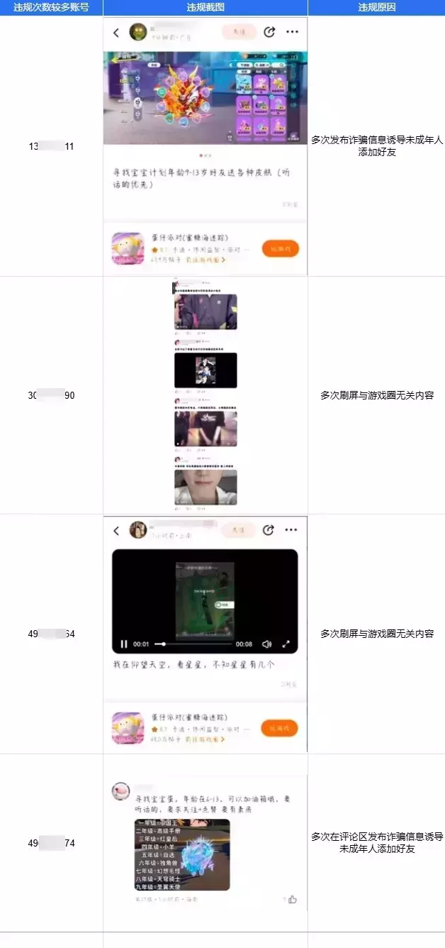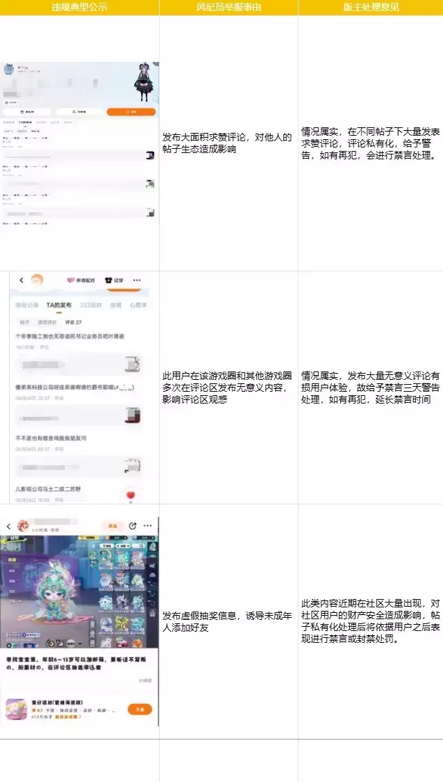 本次对以下玩家提出警告,由于其在游戏圈大量刷屏水贴、在其他玩家评论区频繁发布无关内容,损害游戏圈内容氛围;另外多次发布虚假送礼帖,存在诱导未成年人添加好友的行为。考虑到以下玩家的往期行为,均给予禁言、封禁处罚。