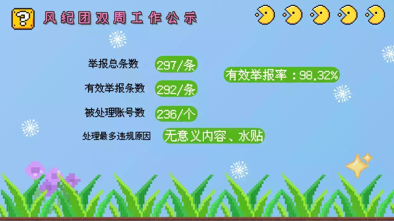 滴滴!大家好久不见哇!这里是拼好饭,这里为大家带来风纪团第二期双周工作情况汇报啦~~