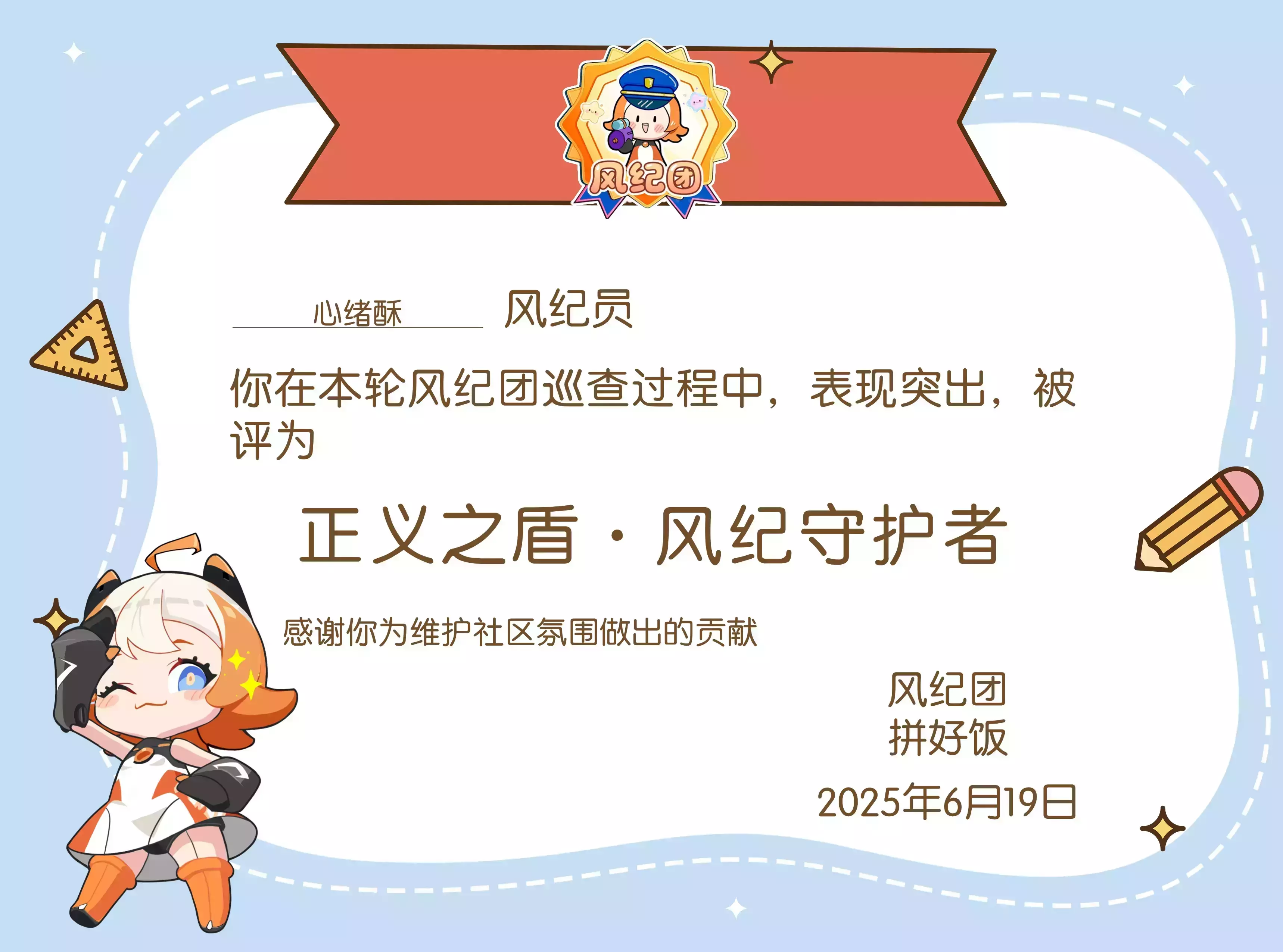 最后让我们对本期优秀风纪员进行表彰!拼好饭的电子奖励来啦~一份电子奖状!