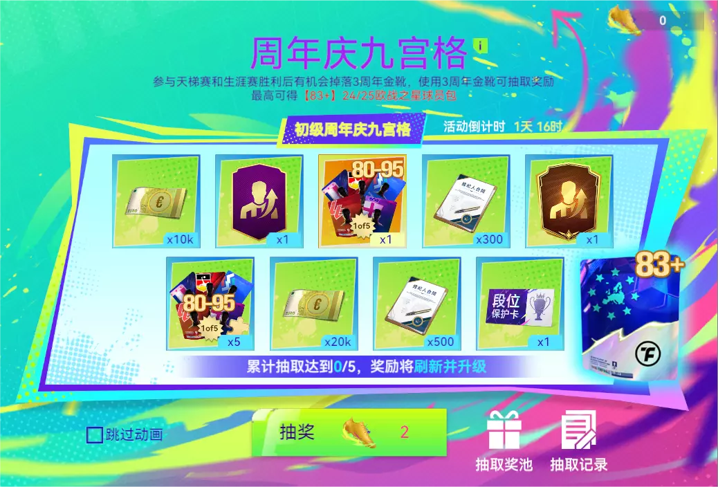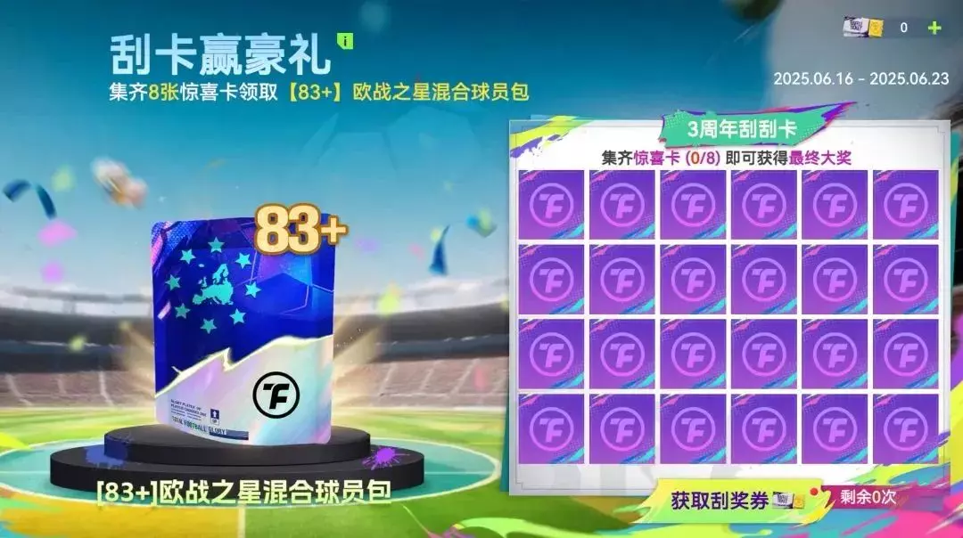 完成任务刮好礼,集齐8张惊喜卡领取【83+】欧战之星混合球员包。