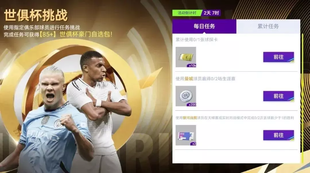 世俱杯挑战,使用指定俱乐部球员进行任务挑战,完成任务可获得【83+】世俱杯豪门自选包!