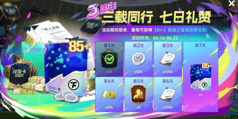 活动期间登录,最高可获得【85+】欧战之星混合球员包。