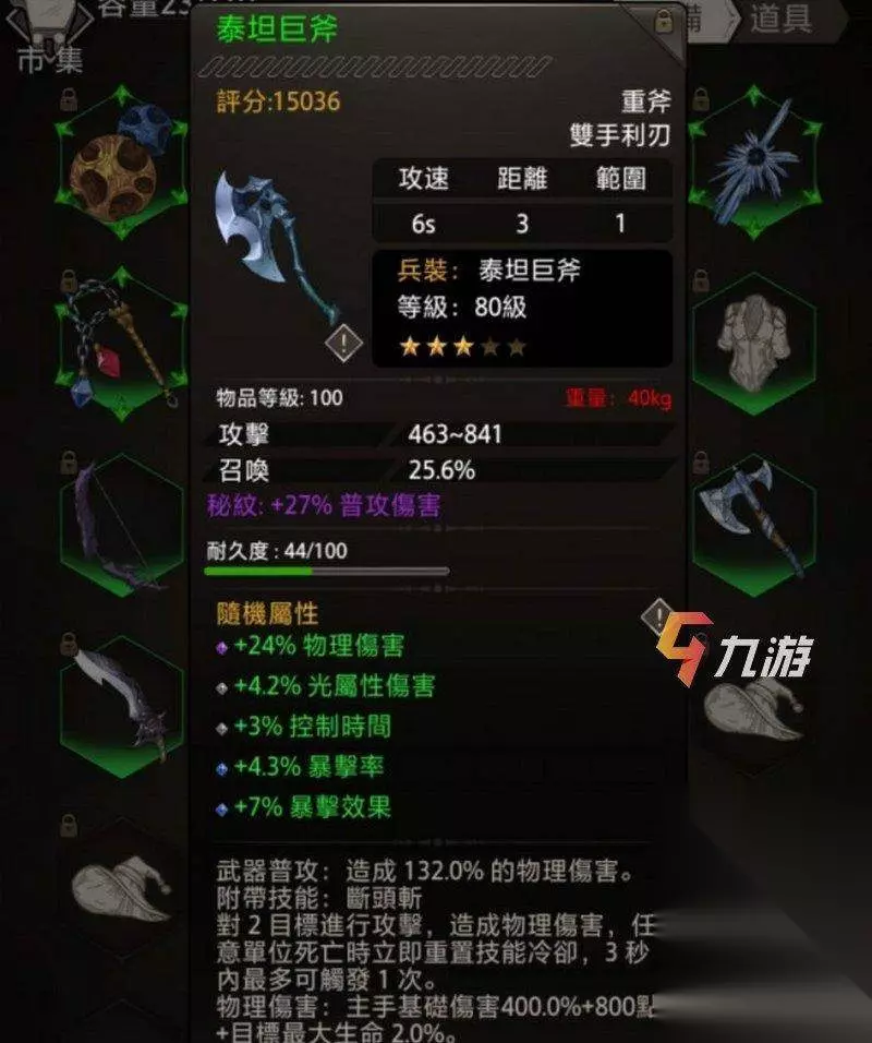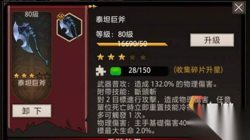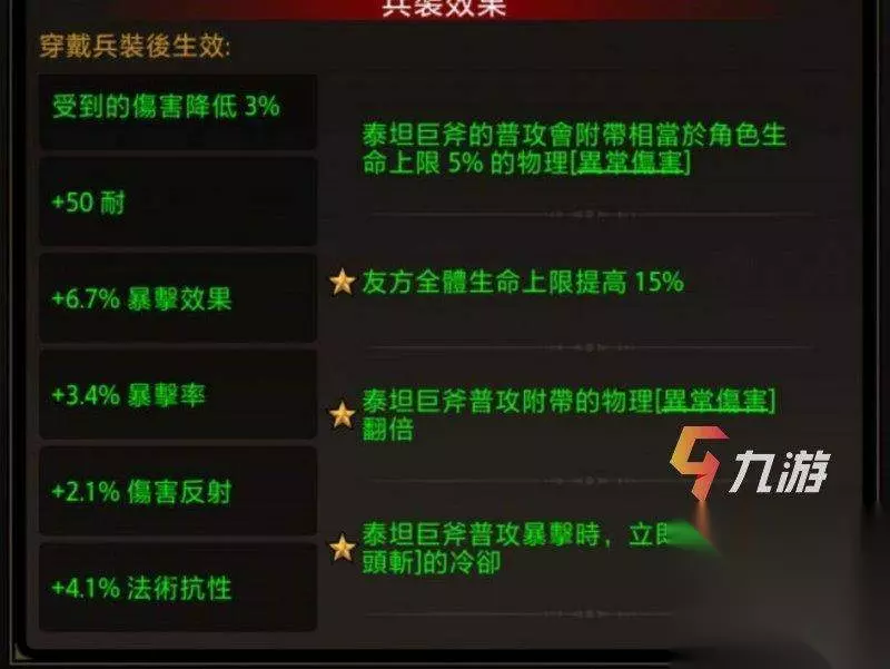 不朽之旅反击流攻略(泰坦巨斧反伤BD): 这个BD只需要1把3星巨斧,甚至UR都不用,相当平民。除非是重氪不然慎抽兵装。只要活下来才能有输出。 我们的中心思想是活下去,输出方面前期靠着战场觉悟和日曜,中后期则靠着反伤,大后期靠兵装普攻的附加伤害。泰坦兵装攻击输出、回复技能(比如说混元盾、金光掌)都是按照血量上限的比例来计算的,所以当然血量越高,收益越大。 其实只要兵装的1星效果“生命+15%”,2星3星是锦上添花。重点就是堆血,然后是护甲减伤以及抗性。