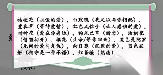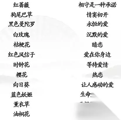 桔梗花(永恒的爱) 白玫瑰(我足以与你相配) 薰衣草(等待爱情) 红色风信子(让人感动的爱) 时钟花(爱在你身边) 狗尾巴草(暗恋) 油桐花(情美初开) 樱花(生命/等你回来) 黑色曼陀罗(无间的爱与复仇) 向日葵(沉默的爱) 蓝色妖姬(相守是一种承诺) 红蔷薇(热恋) 以上内容《汉字找茬王》花语连连看通关攻略就是小编为大家整理的全部内容了,这些内容都是233乐园小编多次验证,翻阅了大量的资料总结出来的。如果你有更好的解决方法,那么就通过评论区告诉小编吧。