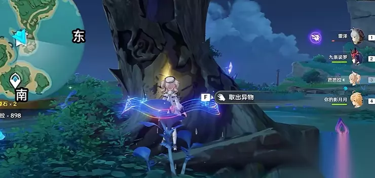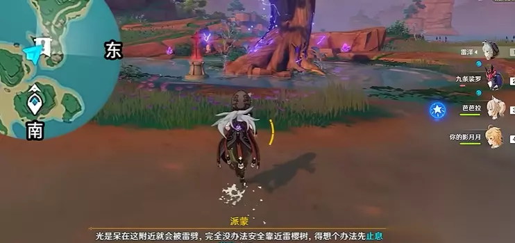 找到雷樱树后,开启元素视野会看到树周围有三个蓝紫色圈圈。咱们需要站在圈内让落雷劈下来,圈会逐渐收缩直至消失。每棵树有三个这样的异常点,全部消除后雷樱树会开花并停止落雷。注意落雷伤害较高,建议带上护盾或治疗角色,避免被劈倒。完成清理后别忘了调查树身取出异物,还能顺手拿个宝箱。