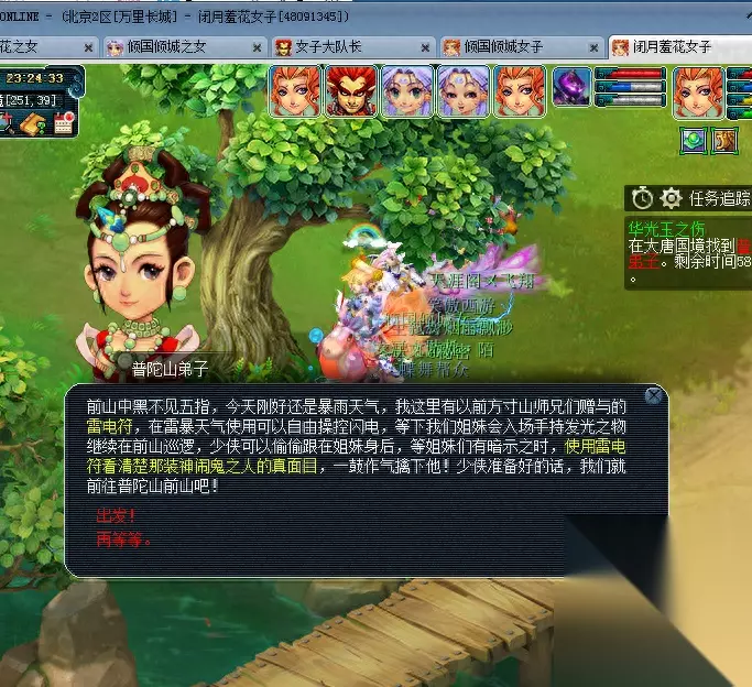 在出现警告的时候 右键背包内的雷电符!然后在普陀山内找神秘人!一定时间内找不到会失败等继续提示 继续找 也 是有点碰运气的成品在里面的!但是也有点小技巧
