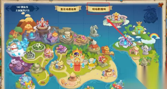 2、玩家打开世界地图后,再点击打开找场景/宠物的选项。