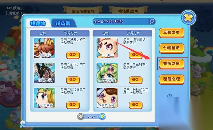 3、打开找场景/宠物界面后,点击失落之塔即可进入。