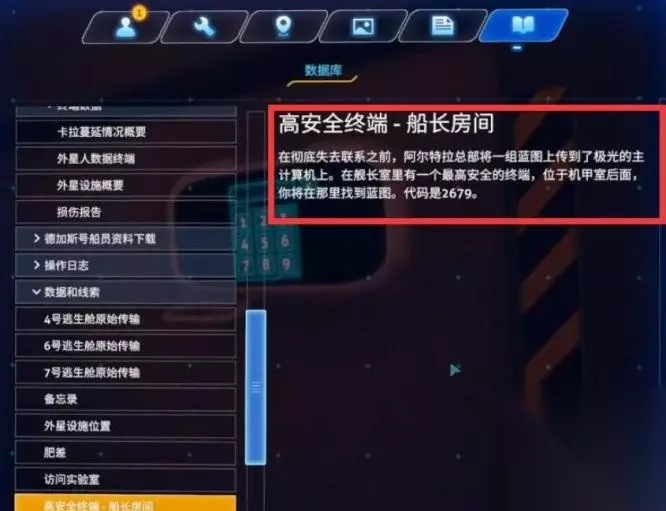 重播 播放00:00/29:11直播 19:15 19:15 进入全屏 50 点击按住可拖动视频 船长房间的密码是2679。 船长房间在宿舍区域内,可以找到船长房间,进入船长房间是需要输入密码的。 船长(舰长)房间的密码在高安全终端-船长房间这份资料里面,密码是2679。收到总部信号和12号舱求救信号便是探索极光号的时候了。总部信号对话里可以获得高安全终端-船长房间这份资料。