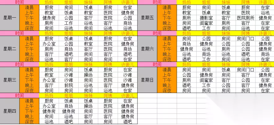 完成后,以后沙滩就有许薇儿(注:好感度到红心会出现)许薇儿在沙滩不是周日在,用天眼看什么时间在沙滩!,许薇儿沙滩剧情开放(具体好感自行探索) 许薇儿和姐姐,有几个剧情串在一起,建议一起攻略 闺蜜教学有好感控制,好感足够,解锁下个教学,许薇儿家 2 楼,早上卧室睡觉(会触发后续剧情任务),深夜房间,浴池、公园有日常, 闺蜜早上房间达到 80 好感,会触发健身房任务 周日下午,去健身房触发剧情后续,获得任务:真实的欲望 接到任务:真实的欲望。周日去姐姐公司 2 楼(需要完成姐姐前置)触发剧情 然后周日下午去小区健身房闪光触发剧情 完成任务:真实的欲望 表姐 现在上午、下午在医院,20 好感触发 COS 服任务,去市区商店,再去公园寻找 cos 少女, 找表姐完成任务,解锁医院日常(下午医院日常)。 上午医院找表姐,触发任务:顺其自然 然后去商场购买内衣. 然后上午医院找表姐,触发剧情。完成任务:顺其自然 开启上午医院日常 COS 少女剧情: 携带商场 cos 少女专属的衣服 去公园找 COS 少女。触发剧情 触发完上面的剧情后 再次点击 COS 少女。 PS:cos 少女之有晚上会在公园出现 阿姨线: 游戏十天后,清晨厨房和妈妈对话,开启 前期刷好感,xc低于 20 触发前置任务 前置任务:阿姨好感大于 80 后,在猪脚家 2 楼,周末早晨(点妈妈房间门口红心),触发妈妈生病任务,下一周日清晨去阿姨办公室触发妈妈出院任务,以及后续阿姨前置,阿姨生气了,寻找椅子,厨房触发剧情,结束触发姨夫的办法(一) 周五晚上酒吧,触发剧情,接到任务:抉择 周日晚上酒吧,触发剧情双线选择,(N 别人和 NTR 互 N) ① 选择 N 别人: 接到任务,双倍快乐。 周日晚上酒吧找姨夫商量,周一晚上去阿姨家阿姨房间触发剧情,触发任务:三倍快乐 深夜酒吧触发剧情, 然后周五晚上酒吧触发剧情 深夜后阿姨家,表姐房间触发剧情失手杀死姨夫,阿姨家寻找铁锹麻袋(点击箱子闪光,在阿姨家厕所上方) 公园闪光触发,埋尸体。 之后回阿姨家,表姐房间触发剧情 获得任务:四倍快乐 周日上午客厅触发妈妈阿姨对话剧情 周三晚上去阿姨家问阿姨。 周二晚上去妈妈房间触发剧情 完成任务:四倍快乐 获得任务:全家桶的诱惑 后周一晚上去表姐房间触发剧情,之后找到药(电脑购买)。 妈妈在厨房的时候带着药触发剧情, 阿姨在厨房的时候带着药触发剧情, 姐姐在客厅吃饭的时候带着药触发剧情, 周五晚上带着药去表姐房间触发剧情, 周六清晨家里触发剧情 然后去厕所触发剧情, 回到客厅触发剧情, 完成任务:全家桶的诱惑 ② 选择 NTR 互 N: 接到任务,互相伤害。 周日深夜,回主角家,进门,触发亮点(感叹号!),触发任务:互相伤害(一) 阿姨家,找姨夫对话, 然后去姐姐房间触发剧情 CG。 之后去表姐房间触发剧情 CG。 获取任务 互相伤害(二) 深夜去郊区许薇儿家门口,触发剧情 然后去商业区寻找私家侦探,寻找私家侦探后,去阿姨家寻找姨夫的照片(阿姨房间桌子上)。 再去私家侦探,触发剧情, 之后去姐姐公司找公司老板。 之后再次去私人侦探所寻求帮助,找到悦儿的照片后, 再次去找公司老板悦儿,触发剧情, 第二天晚上去公司接悦儿,带悦儿会自己房间触发剧情。 完成任务:互相伤害(二) 获得任务:互相伤害(完)之后去酒吧寻找姨夫(姨夫在酒吧的时间为周五晚上深夜)后, 两人放弃前嫌,完成任务:互相伤害(完) 后续日常:日常 1(周一晚上 妈妈房间) 日常 2(周二晚上阿姨房间) 日常 3(周三晚上姐姐房间) 日常 4(周四晚上表姐房间) 日常 5(周五晚上许薇儿 2F 卧室) 日常 6 (周六晚上公司悦儿) 世界线: 30 天后再自己房间,点击(NPC 狗)接到任务,去工厂,找到怪物,打怪,知道世界交点的入口,深夜在世界交点的空间触发剧情(RNT 可避免),