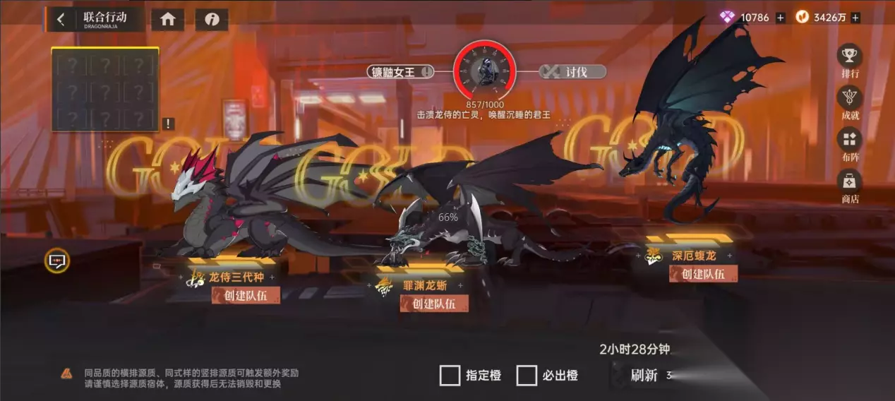 4. 联合行动 是获取七宗罪刀刃(可以提升七宗罪等级)的主要途径。这个活动呢,有三种龙,而每种龙又分为金色紫色蓝色三种品质(当然,金色是最好的),所以呢,需要遵循以下的刷新规则,横排都刷金色的(不需要一样),每一纵都刷成一样的,就是竖排相同的龙,横排相同品质。打了九次龙以后就可以得到一定的奖励。我自己每天都是这么刷的:前三个勾选必出橙,后面六个勾选指定橙,这样应该是花费钻石最少的方法,同时呢,这个活动是可以三人或双人组队的,所以,选择一个固定的搭子一起刷也是一个节约钻石的好方法。