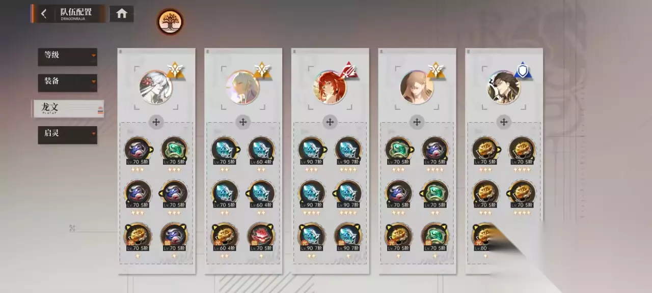 3. 龙文搭配 主c通常用利维坦,后期可以换成奥丁,前排带白帝,奶妈角色带天照命和大蛇。辅助角色随便带,前期没有什么金色龙文的话先给主c用一套输出的就行,以后慢慢刷狩猎补齐。