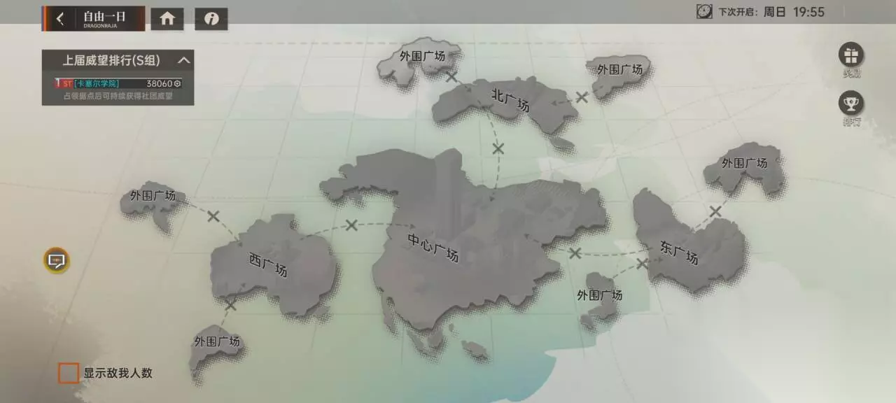③自由一日:占点得积分的活动,玩家需要击败一个点内的所有敌人,并保持一定时间,才可以获得一个点的归属,点可以给社团带来积分,所以,更快的占领高资源的中心岛是在自由一日中获胜的关键。