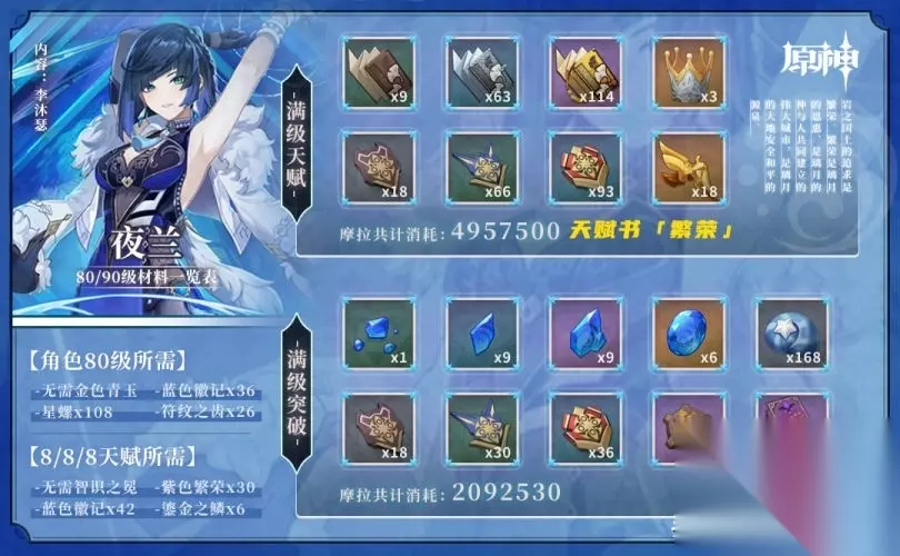 ♦图中右侧为90级以及10/10/10天赋所需,左侧为80级以及8/8/8天赋实际所需,旅行者可以自行按此进行收集,各部分材料的收集已在下方完善。使用若陀龙王周本材料(需完成钟离传说任务第二章——匪石剧情后解锁)