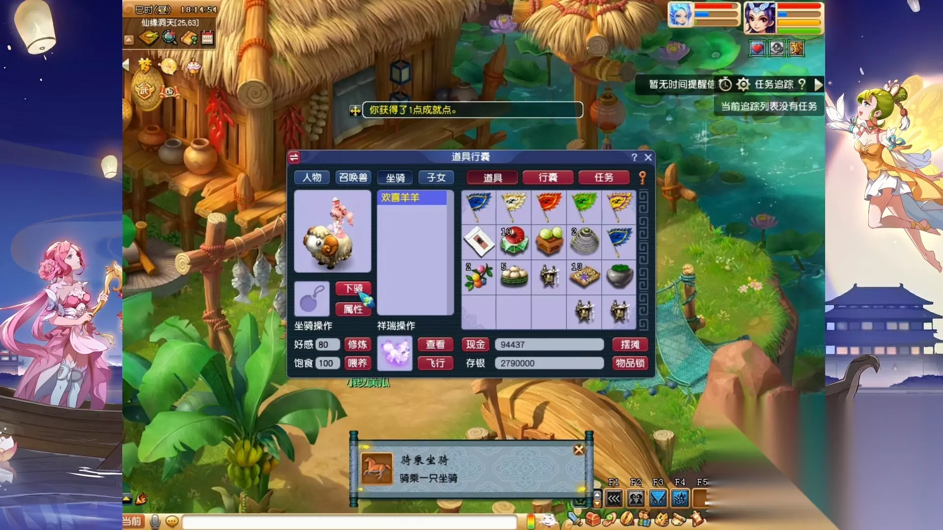 从0开始养号的第74天,大神说他有五个号要拿种族坐骑,可以顺便帮我拿一只,让我把不用打架的任务先过了,根据梦幻精灵的指引,在仙缘洞天找到了百兽王,花了100点体力和8万两银子,领取了坐骑任务!