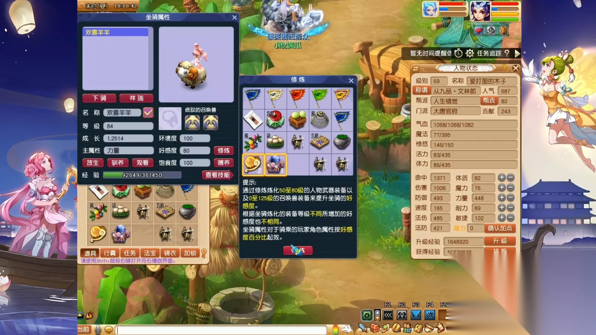 根据大神的指引,花了一千九百万点经验和50点体力,把坐骑升级到了84级,给人物增加了13点伤害呢!给坐骑喂了两个60级的装备和6个50级的装备,好感度从80升到了104,又给人物增加了3点伤害。