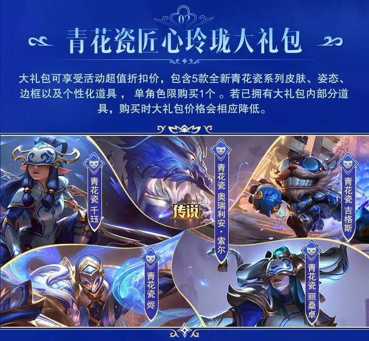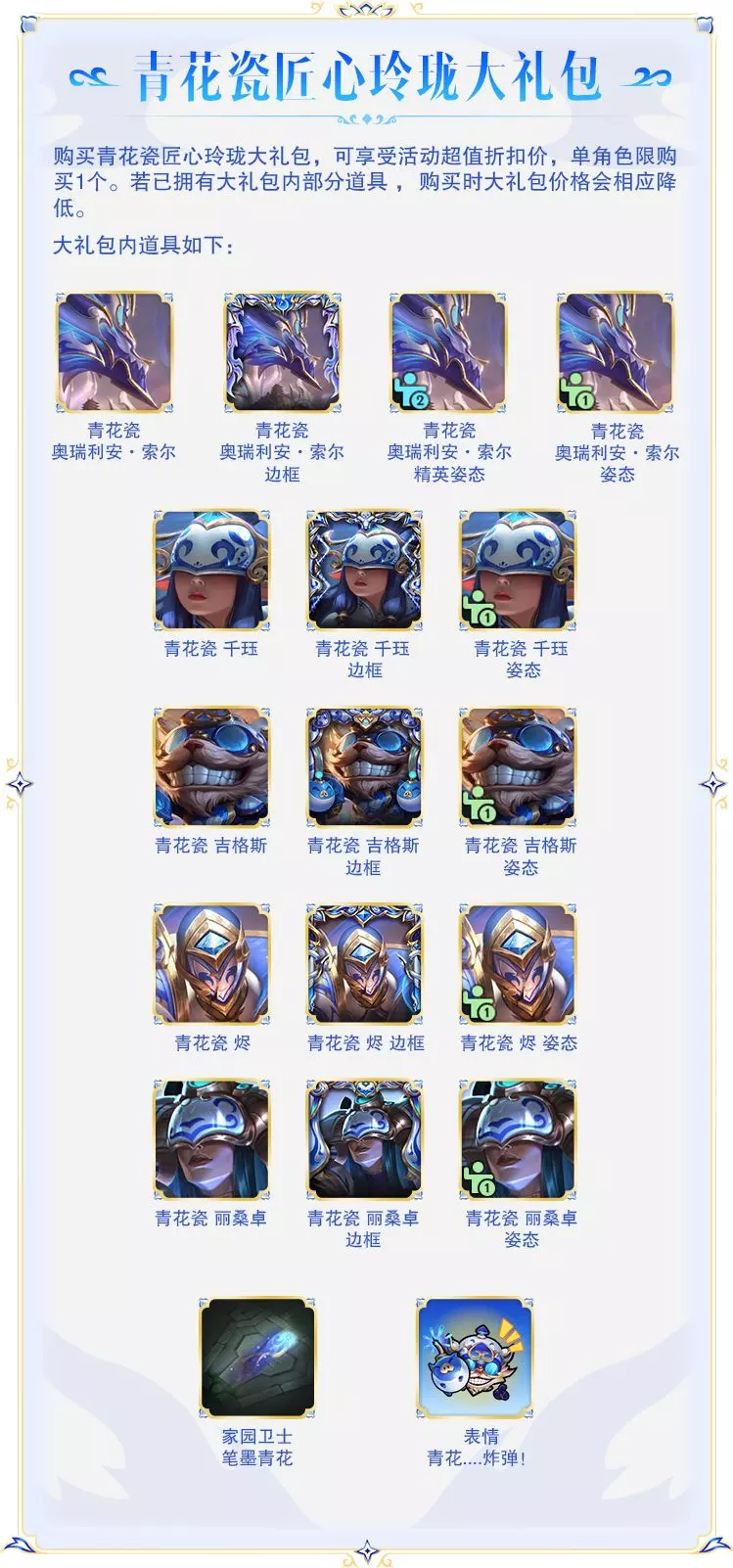 大礼包内包含5款全新青花瓷系列皮肤、皮肤姿态、皮肤边框以及家园卫士-笔墨青花、局内表情-青花....炸弹!。