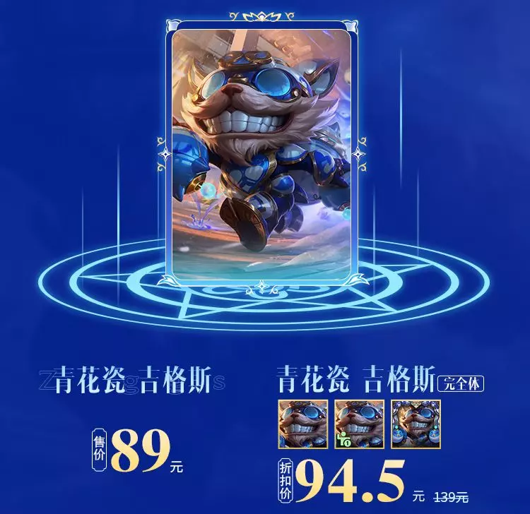 手游首发皮肤青花瓷 吉格斯享超前体验,皮肤售价89元,青花瓷 吉格斯 完全体礼包同步热卖,折扣价94.5元,包含青花瓷 吉格斯皮肤、皮肤姿态、皮肤边框。