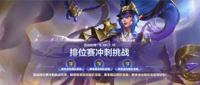 即日起至7月16日,召唤师完成排位赛冲刺挑战任务,即可解锁赛季皮肤随机宝箱、赛季藏品随机宝箱、赛季姿态随机宝箱好礼~