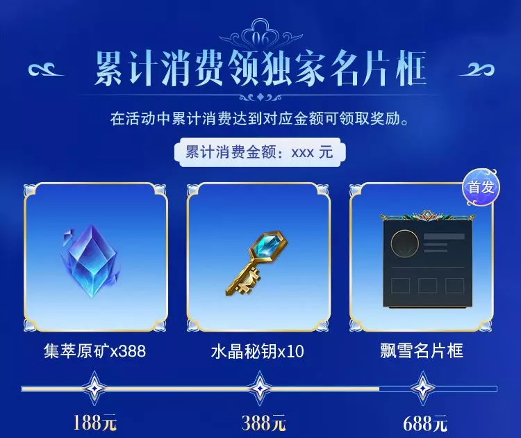 召唤师在活动中累计消费满188元、388元、688元,可分别领取集萃原矿*388、水晶秘钥*10、首发飘雪名片框好礼。