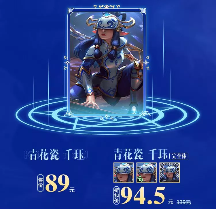 青花瓷 千珏享超前体验,皮肤售价89元,青花瓷 千珏 完全体礼包同步热卖,折扣价94.5元,包含青花瓷 千珏皮肤、皮肤姿态、皮肤边框。