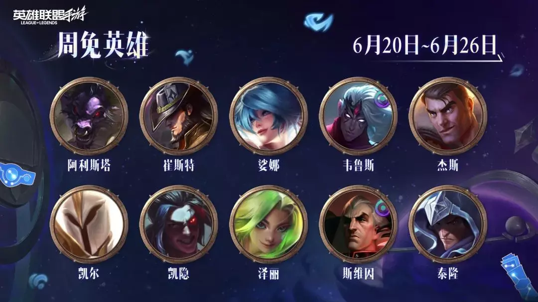 新一轮周免英雄将于6月20日(明日)开启!崔斯特、凯隐、泰隆等人气英雄名列其中,召唤师们快携手心仪的英雄在峡谷中大展身手吧!