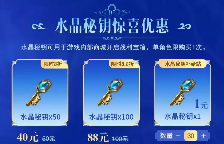 水晶秘钥惊喜优惠来袭,最低8折起,单角色(单区游戏角色)限购买1次。
