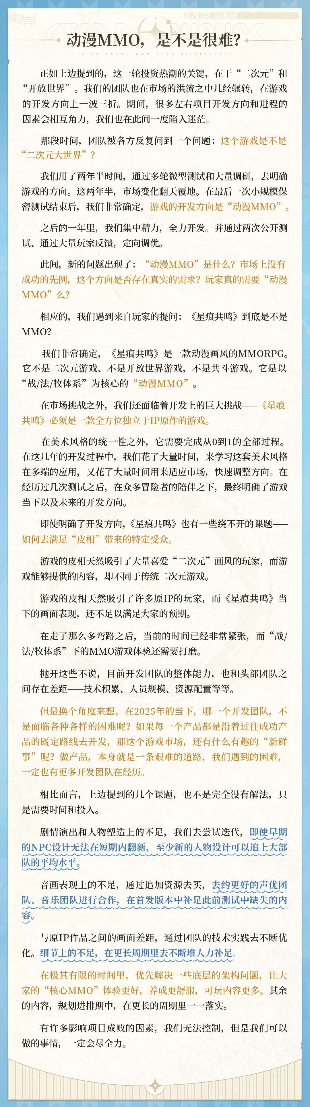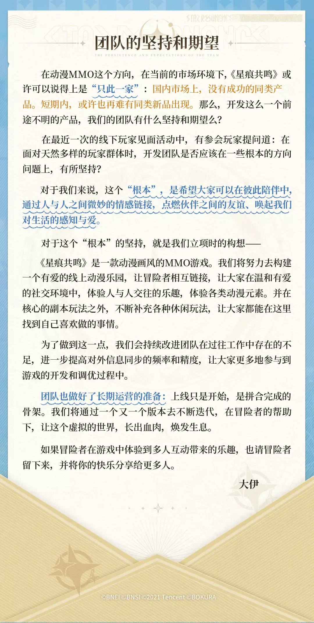 这里是一封来自制作人-大伊的信件,希望通过这份信件,和大家讲述关于《星痕共鸣》开发背后的故事。